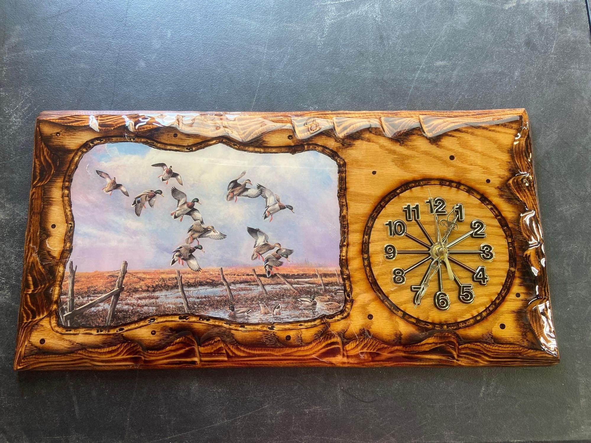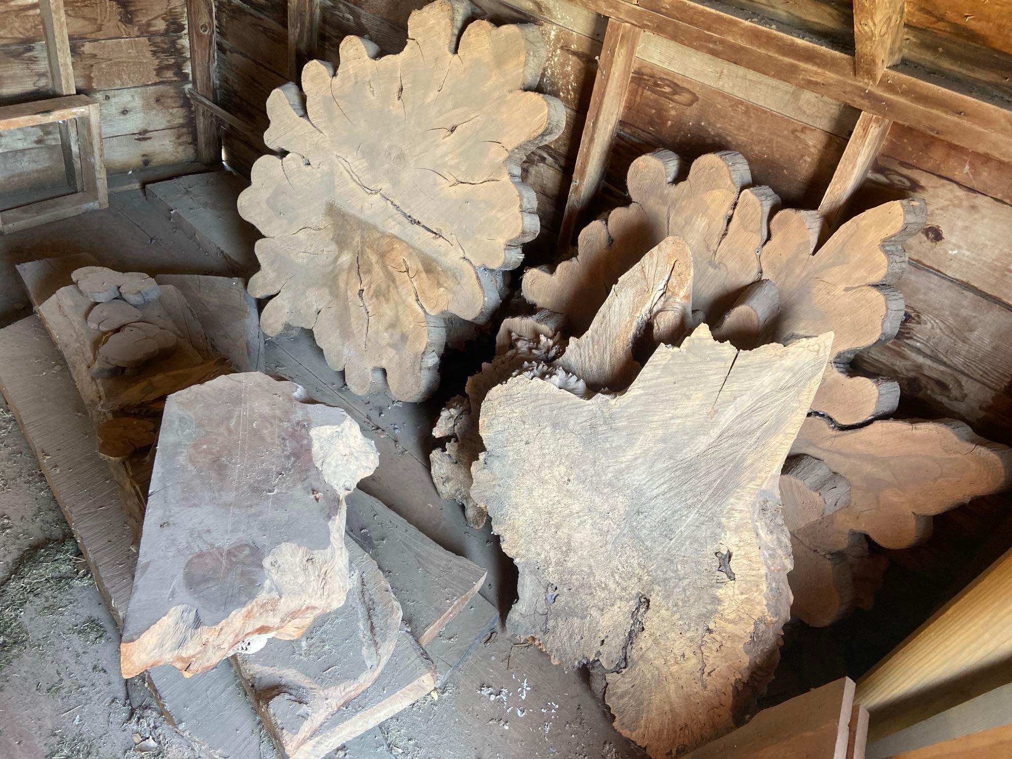 also includes tools, live edge wood slabs, clock making parts, an upright