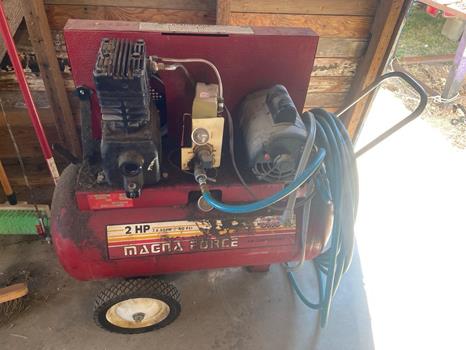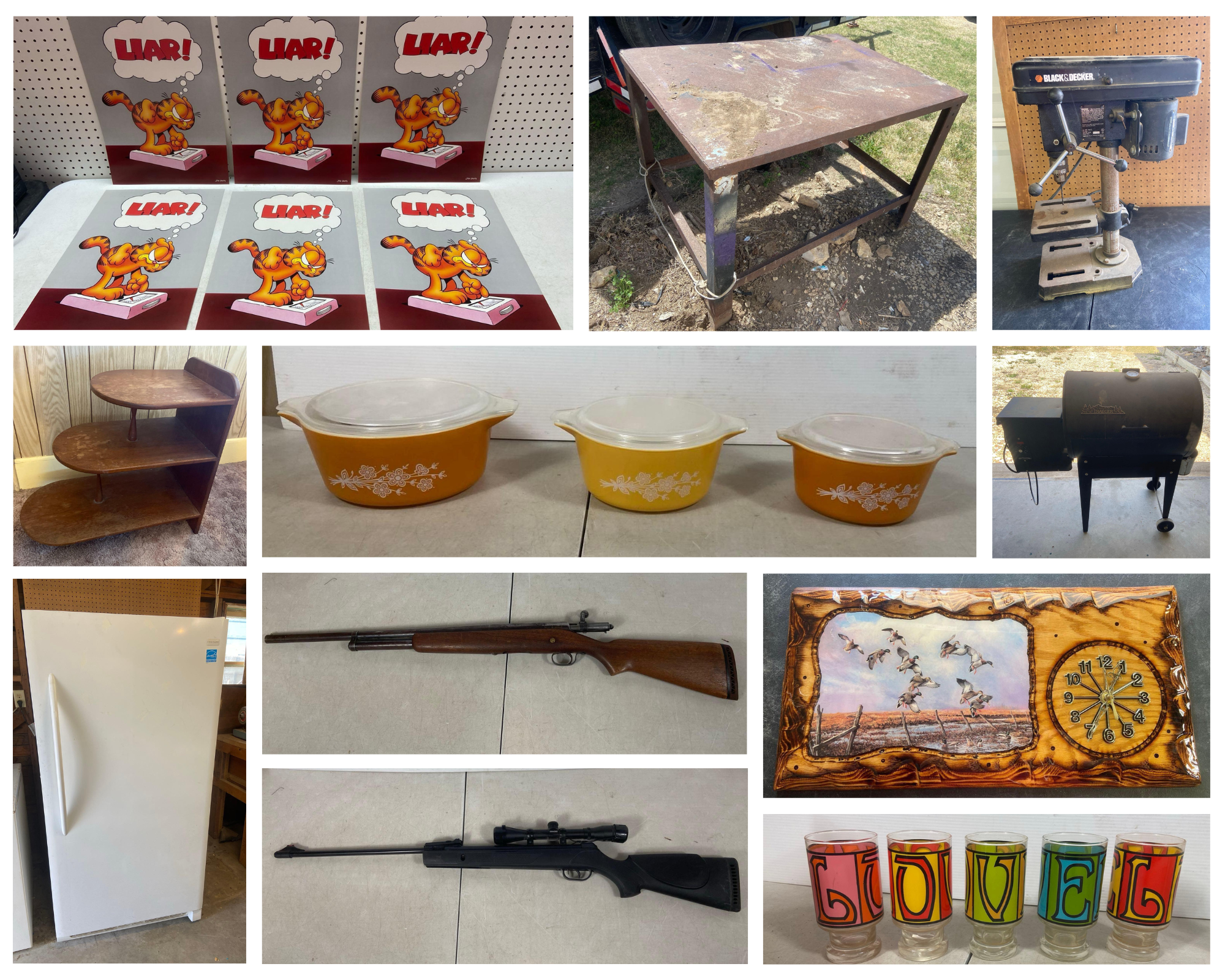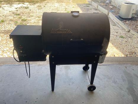 freezer, some collectibles, household items, a Traeger grill, steel welding