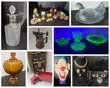 vintage glassware, costume jewelry, Coca Cola collectibles, salt and pepper